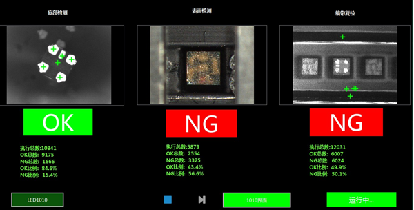 LED視覺(jué)檢測(cè)系統(tǒng)由我司自主研發(fā),適用于貼片LED底部缺陷,正面反料、側(cè)料、倒料、缺料、邊緣毛刺檢測(cè)及包裝復(fù)檢,檢測(cè)速度高達(dá)45K/小時(shí)。過(guò)檢率小于萬(wàn)分之三,無(wú)漏檢。檢測(cè)規(guī)格包含LED-1010、LED-2121、LED-2835等規(guī)格的貼片LED。