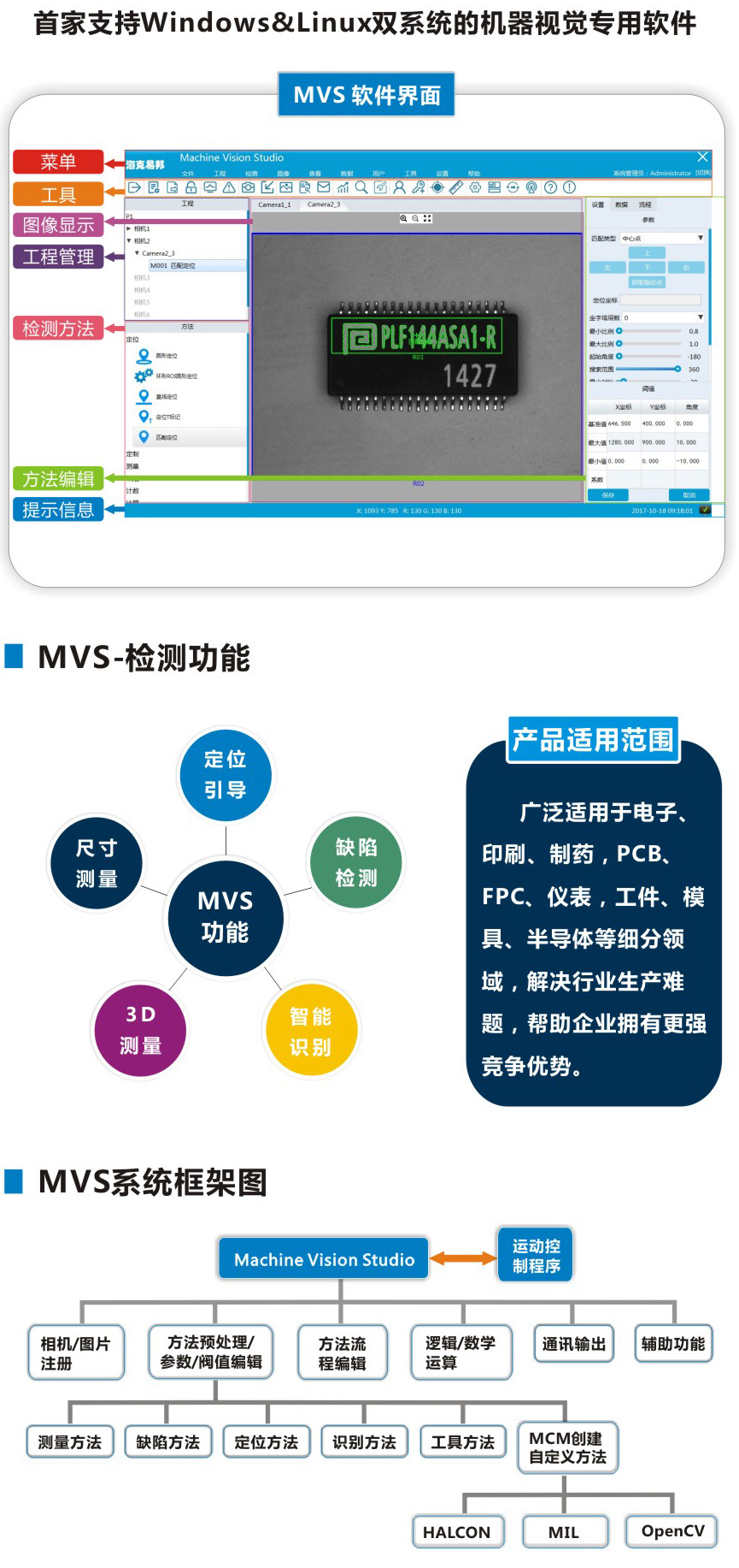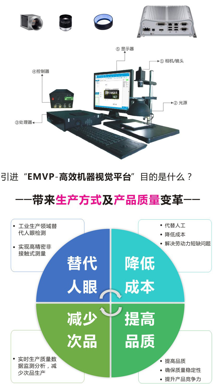 EMVP開放式機器視覺平臺是海克易邦獨立自主開發的機器視覺產品。該產品集軟件和硬件于一體,整合本公司在機器視覺行業十年技術積累,同時結合各類視覺檢測的實際需求而推出,為客戶提供最優的機器視覺解決方案。產品軟件最新推出MVS版本,操作更加簡單,設置更加靈活,同時支持高級用戶二次開發。EMVP機器視覺平臺具有集成度高、功能豐富、穩定可靠等特點,適用于缺陷檢測、尺寸測量、定位引導、字符識別、平整度檢測等機器視覺應用領域。