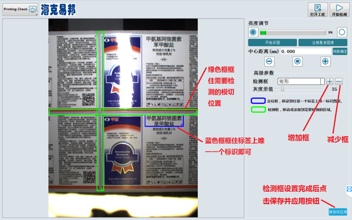 檢測時實時定位商標特定圖案,給出當前位置的初始位置的偏差,檢測區域位置自動補償,實現產品自動定位功能。